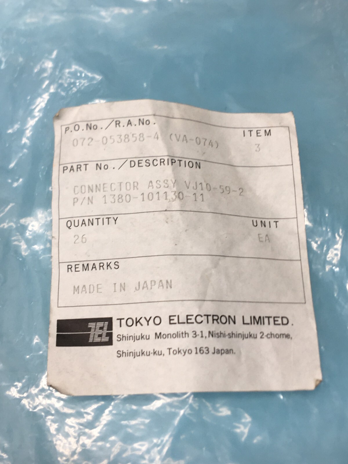 26 SMC TOKYO ELECTRON TEL 1380-101130-11 CONNECTOR, VJ10-59-2